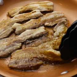 sauce over the pork belly slices. After about 3 minutes flip the slices of pork belly and