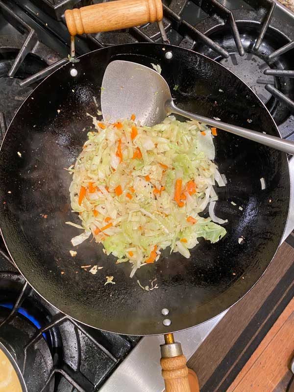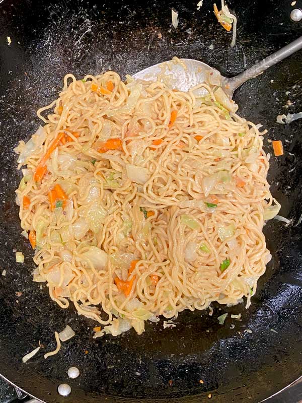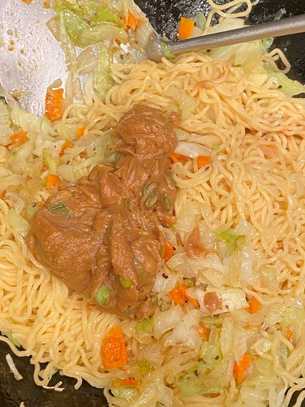 - Add the cooked ramen noodles and sautéed vegetables to the peanut butter sauce. Toss until the noodles and vegetables are coated evenly.